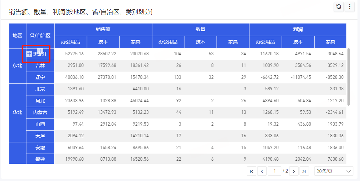 以默认数据模型为例,查看各地区的产品销售额、利润、数量,将涉及到4个字段:维度“类别”、“地区”,度量“销售额”、“利润”、“数量”。