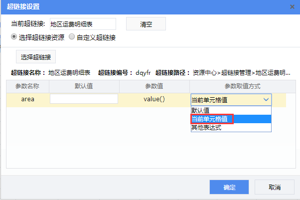 选择超链接后会自动显示出之前的超链接参数,此时点击参数取值方式栏的下拉列表,选择“当前单元格值”选项,点击[确定]。