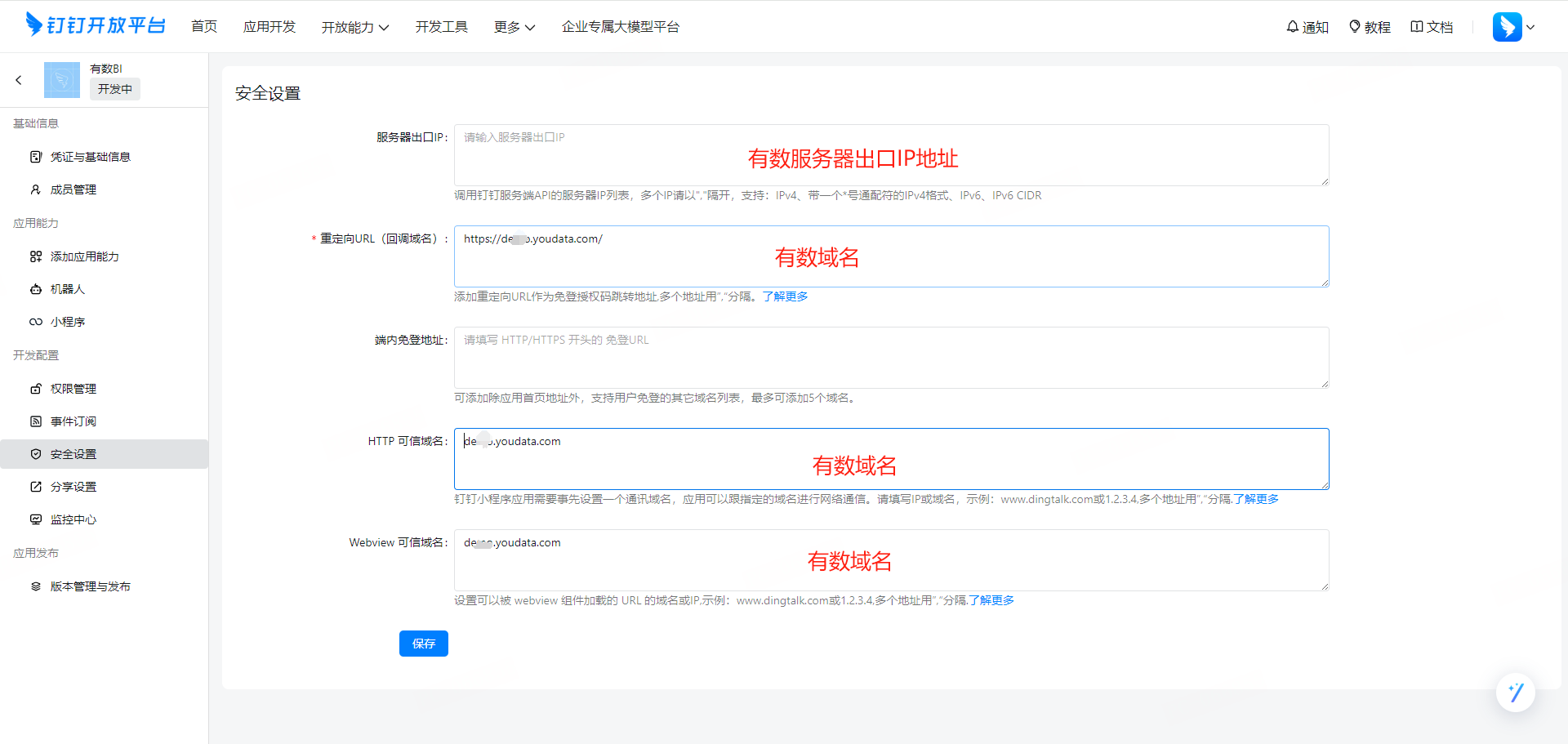(2)点击【安全设置】,填写服务器出口IP需填写本产品部署的服务器出口IP、以及有数域名。