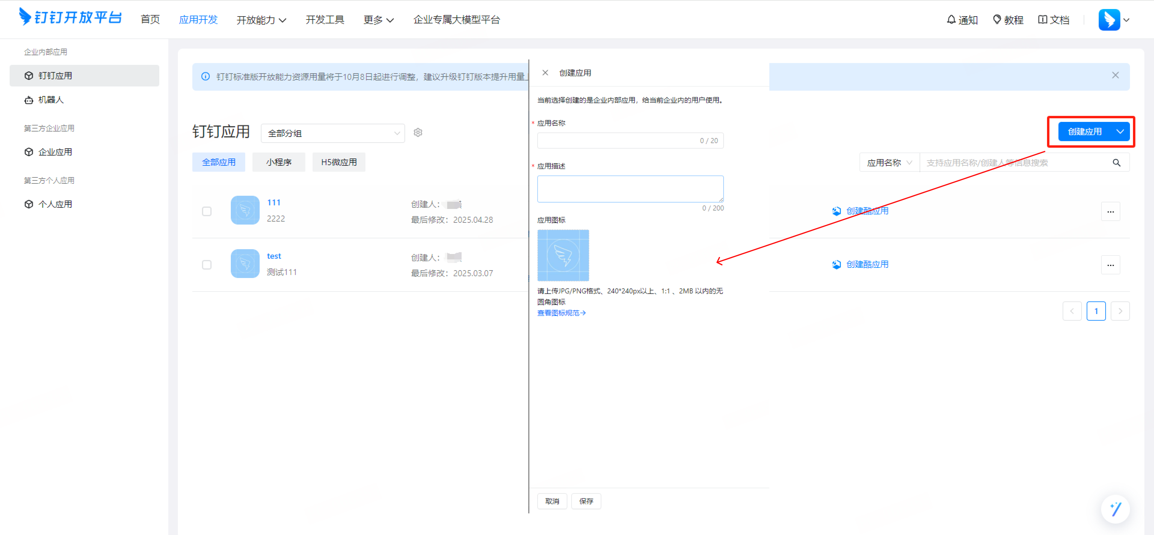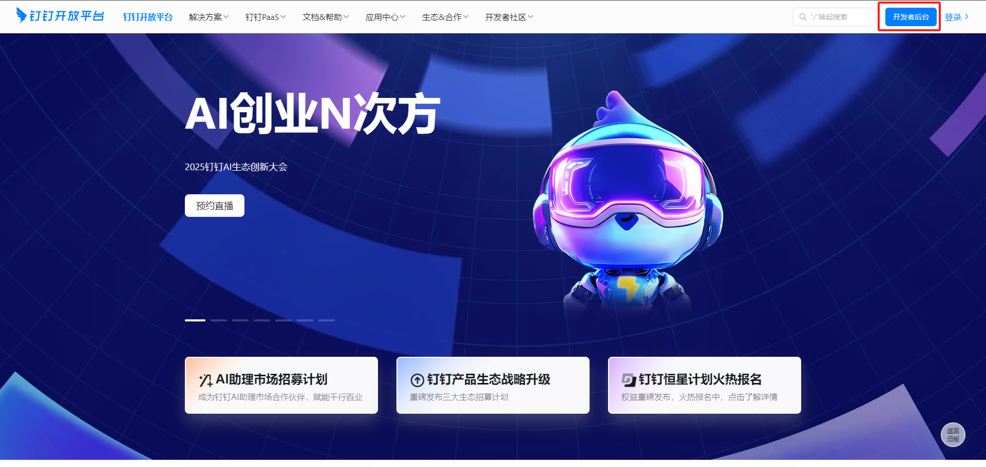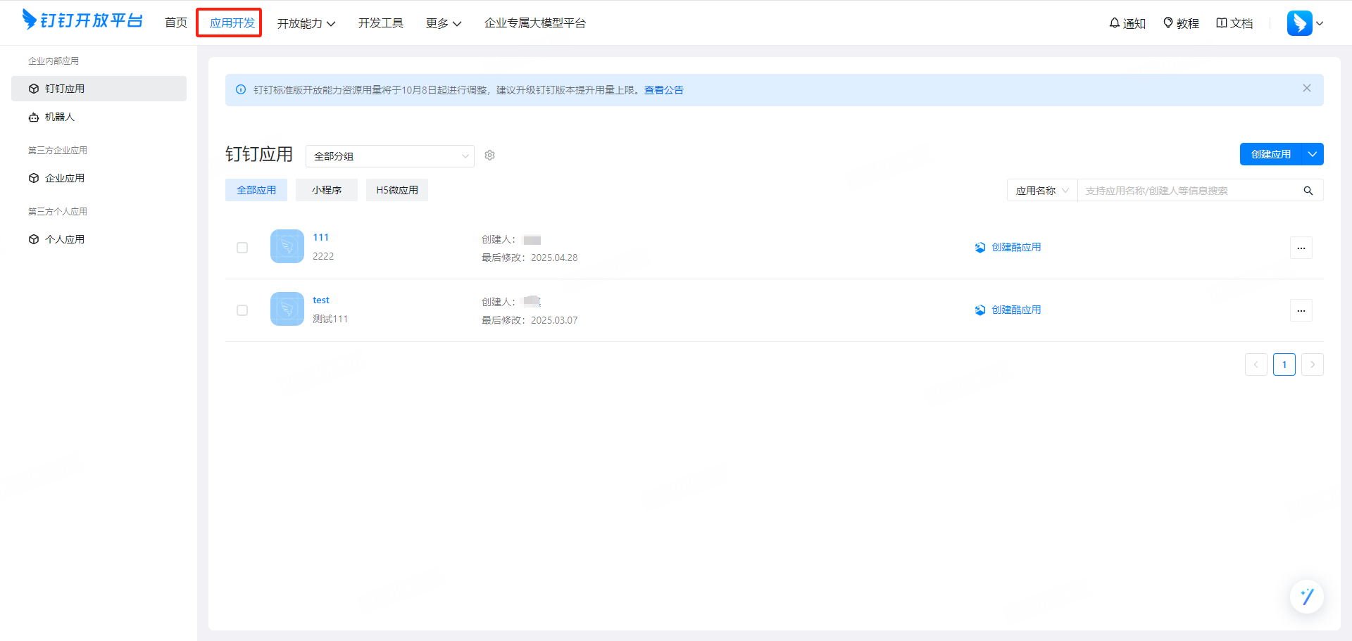 (1)企业使用管理员账号进入钉钉开放平台,登录开发者后台,选择应用开发-企业内部应用;