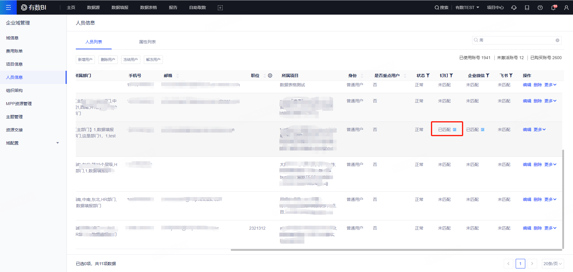 用户在钉钉上首次登录小程序后,在【企业域管理】-【人员信息】页面的人员列表可以看到已匹配用户的基本信息,且该用户下次即可在钉钉端免密登录小程序。