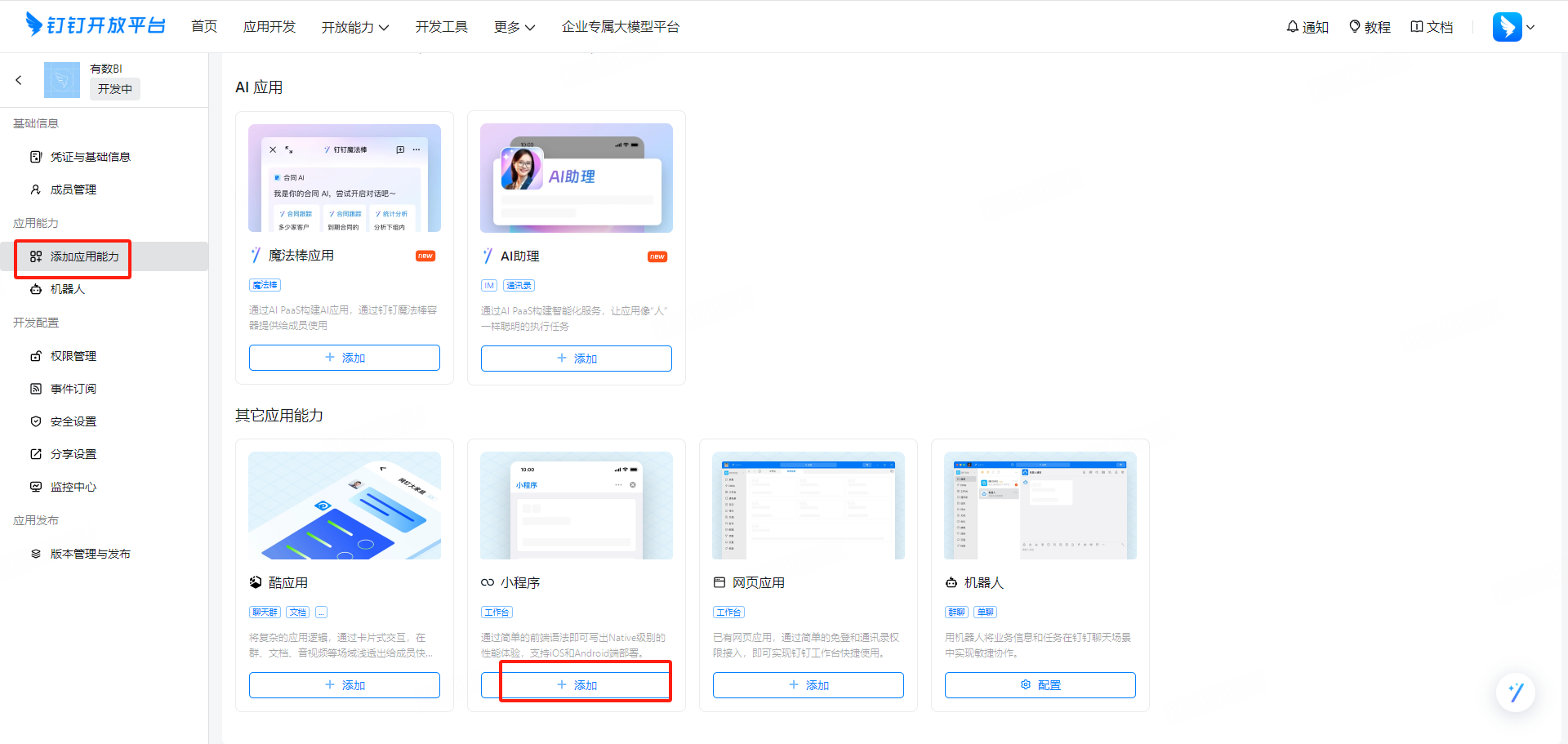 自动跳入应用开发界面,选择【应用能力】-【添加应用能力】-【添加小程序】;