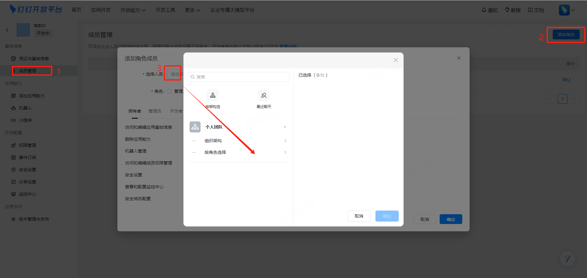 (1)人员设置。添加开发人员,将企业域内的开发员工添加为应用开发人员。