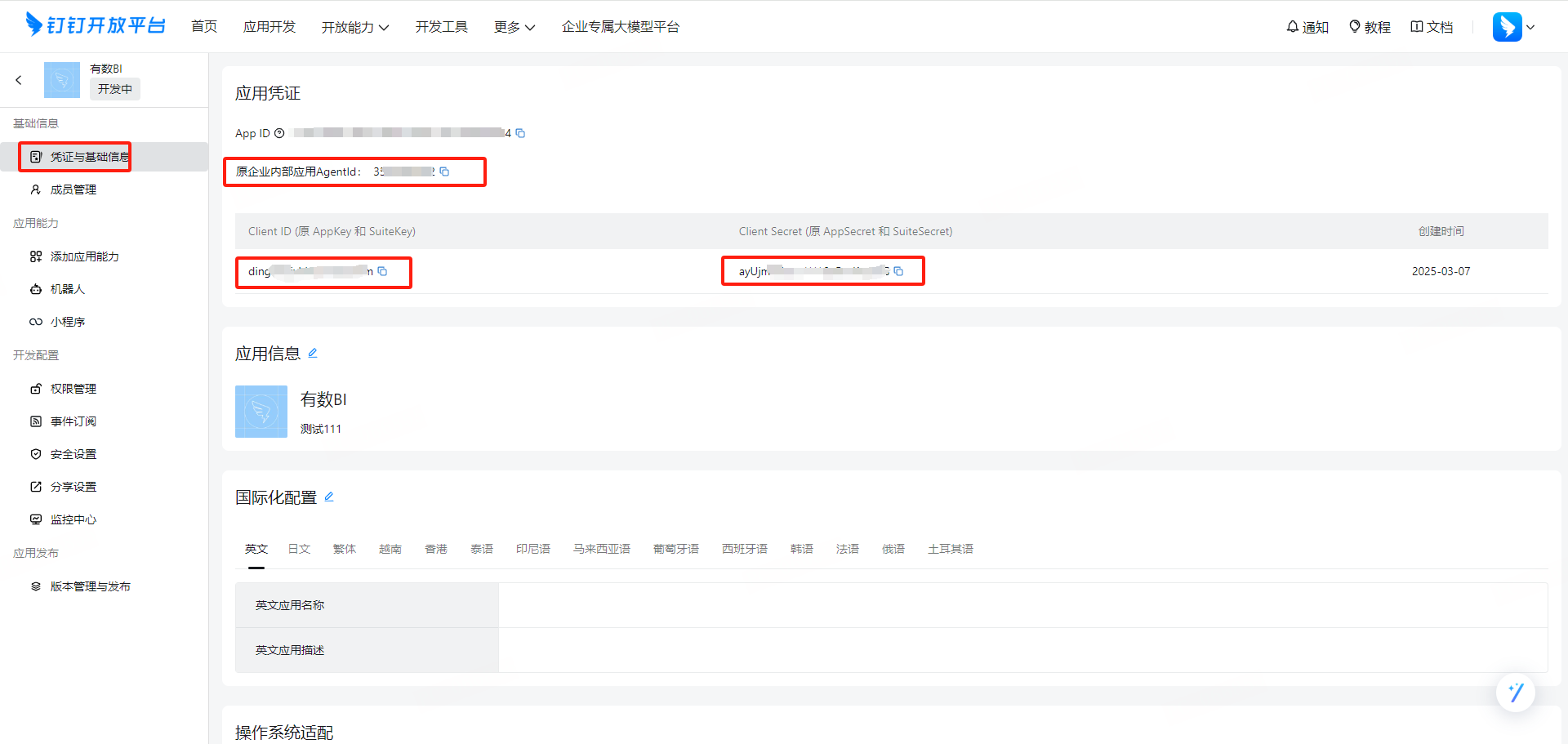 添加小程序后,点击凭证与基础信息,可看到应用的三个重要参数:AgentId、AppKey、AppSecret。
