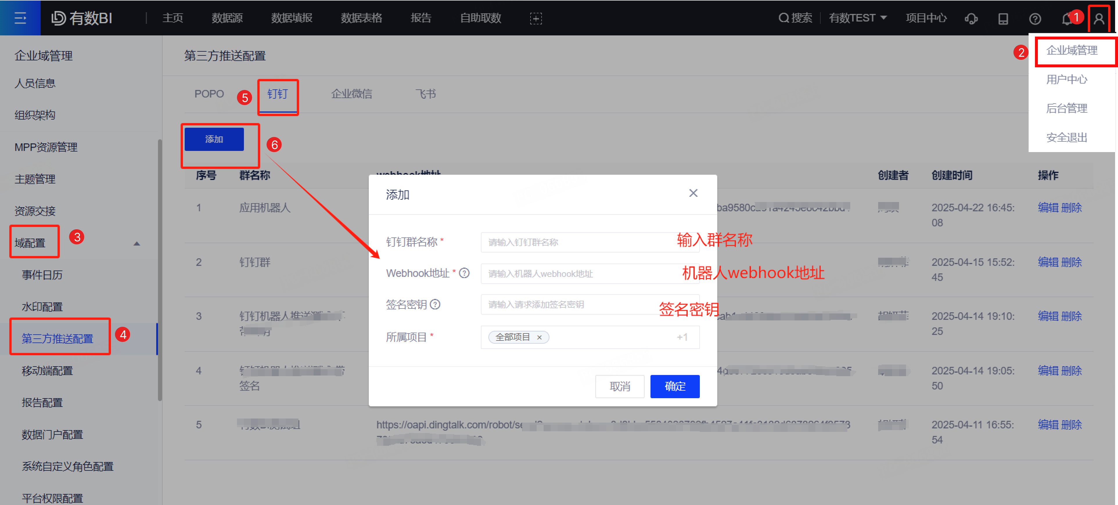入口:【平台管理/域管理】-【域配置】-【第三方推送配置】-【钉钉】