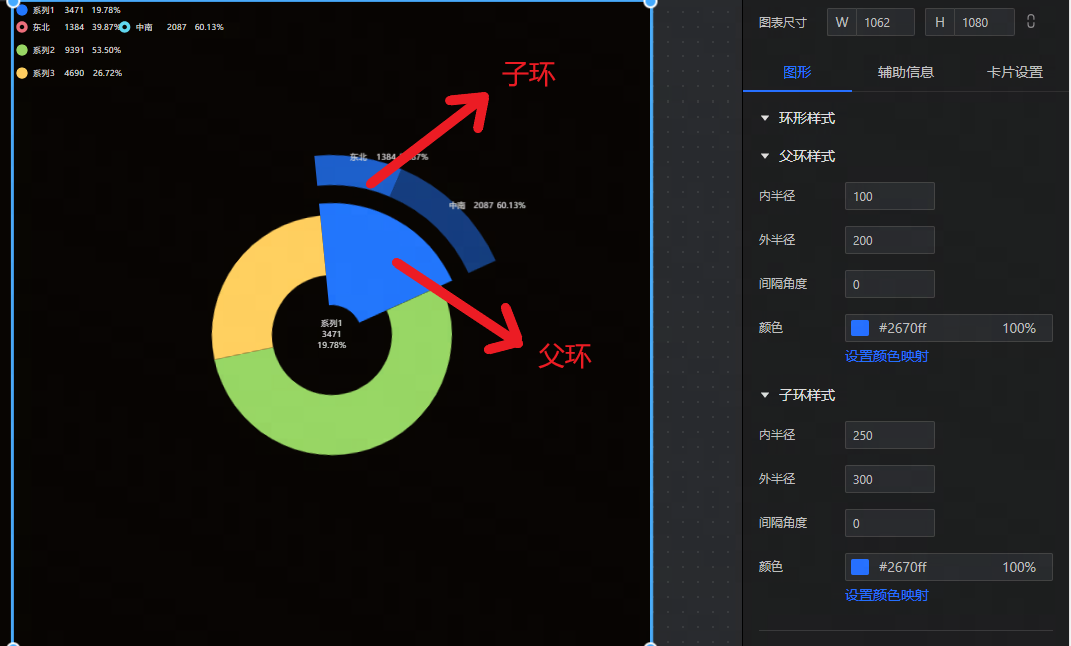 - 环形样式:设置父/子环的内半径、外半径、相隔角度、颜色。