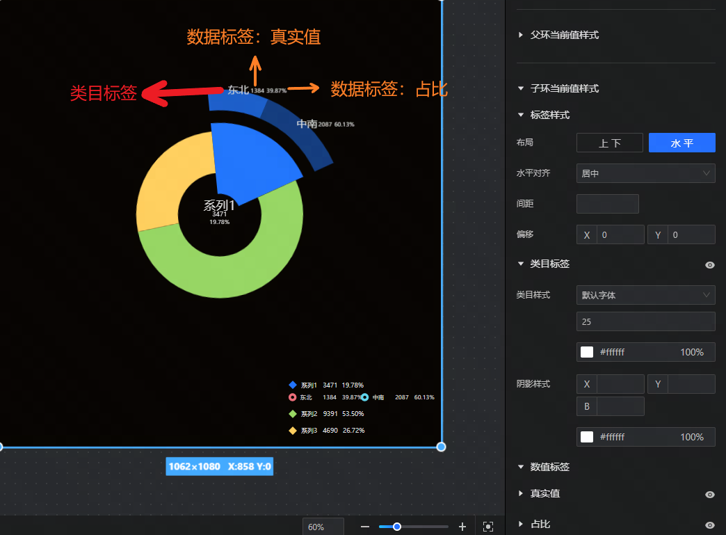 - 父环当前样值:设置是否显示父环的类目标签或数值标签,以及设置类目标签样式和数值标签样式。
