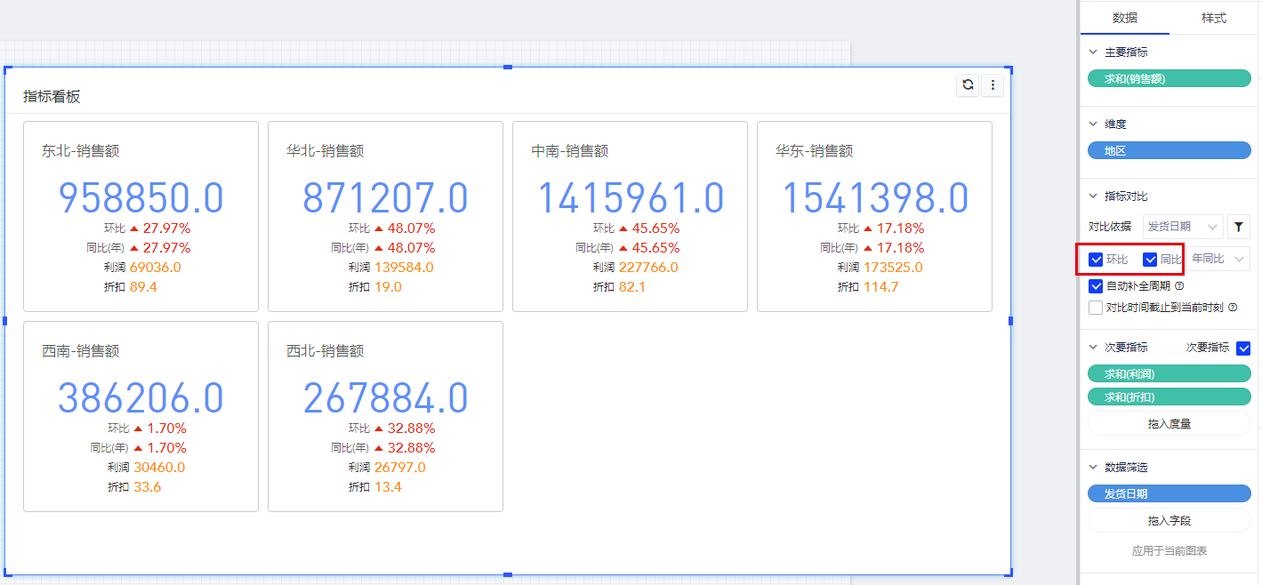 (6)指标看板也允许添加同环比数据,且同环比的计算仅针对主要指标,设置规则与指标卡一致。增加同环比后,单指标卡的排列顺序依次为主要指标、主要指标的同环比数据、次要指标。